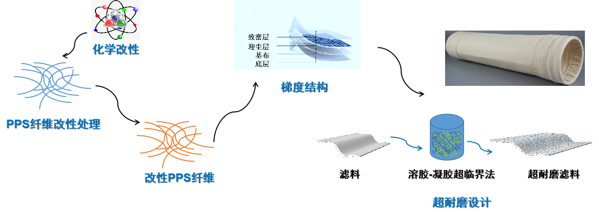 • 改性PPS纤维:通过对纤维进行改性处理改善其拉伸性能,进而使滤料具有优异的断裂强力和断裂伸长率;